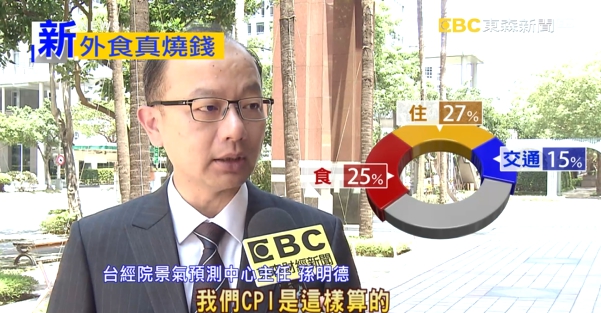 台經院景氣預測中心主任孫明德:「吃佔25%;住佔27%;交通佔15%,我們CPI是這樣算的,所以民眾最容易記得的是吃跟交通,但是CPI因為什麼都有,都有權重,所以計算上跟民眾感受上,落差比較大。」