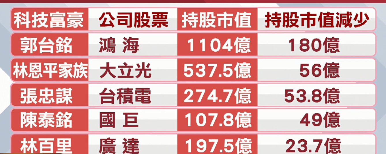 股災籠罩,台灣科技富豪資產也大失血,總共縮水逾360億元,其中最慘的就是郭董,10月以來口袋蒸發180億,大立光執行長林恩平和台積電創辦人張忠謀,資產也都大減超過50億元。