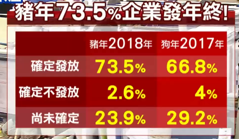 根據調查,2018確定發放年終企業約占七成,比去年高了6.7%,不發放企業則較去年下滑2.6%。民眾蘇先生:「老闆對員工的評比,通常員工不是很滿意啦,但是它並不是全面啦。」