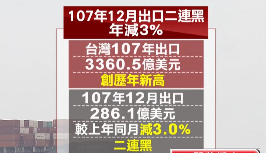 ▲台灣107年12月總出口286.1億美元,較上年同月減3.0%。(圖/東森新聞資料畫面)