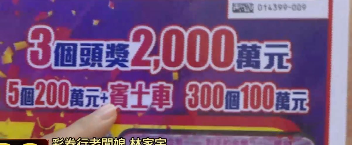 彩券行老闆娘林家宇:「媽媽說要發給我5萬8千8,有發發,要讓我一路一直發,跟中獎人一樣一直發。」而中大獎的刮刮樂就是這張,台彩公司推出的2000元過年限定版,2000萬超級紅包。