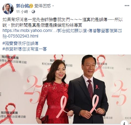 媒體報導,鴻海集團總裁郭台銘夫人曾馨瑩懷了第4胎,準備迎接豬寶寶。郭台銘今天晚間表示,這真的是誤傳,若有好消息會先告訴臉書朋友們,「恭賀新禧但沒有這一喜」。