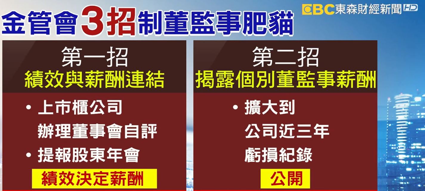 立委曾銘宗:「假設它是在虧損狀態,或者盈餘大幅衰退的情況底下還大幅領取,大額的董監事酬勞非常非常的不公平也不合理,而且他領的錢可能就是股東的錢。」金管會出招,未來董事會通通要交報告給股東,透過績效評鑑決定薪酬,公開個別董監事薪酬,條件也由公司近兩年有虧損紀錄,追溯到近三年,就是怕公司虧肥貓還是坐領高薪。