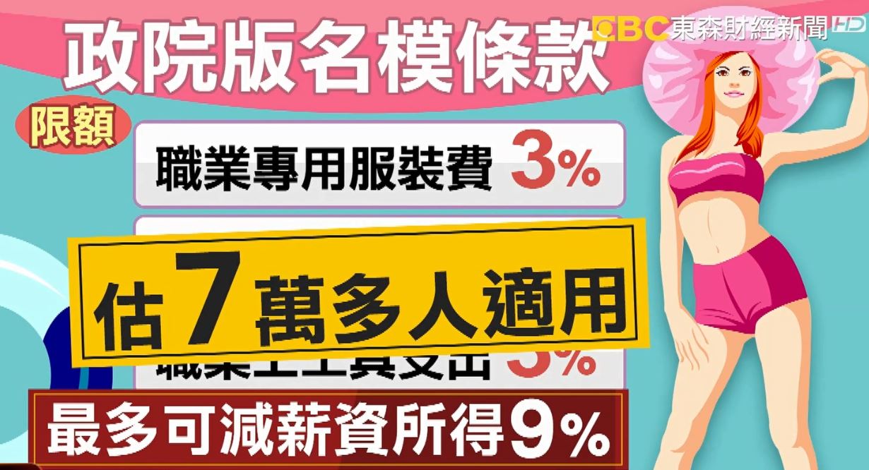 民眾:「這可以啊,我覺得滿好的。」、「通勤應該會花費滿高的。」、「對公車族,坐捷運的人,或坐火車應該比較有幫助。」政院版名模條款也增訂職業專用服裝費,進修訓練費和職業上工具支出,三項最多共可減除薪資所得9%,初估7萬多人適用,不過小資族恐怕無法受惠。