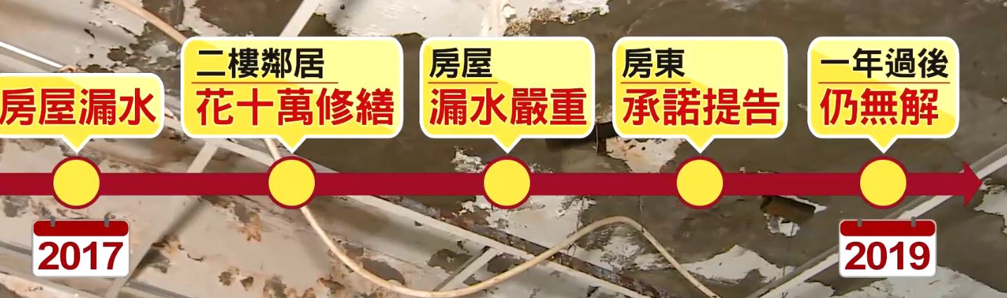 新北市一名黃小姐指控自己租了十年的一樓店面,近兩年來發生漏水的狀況,原本二樓已經有花約十萬元修繕,卻沒有解決,還越來越嚴重,甚至有天花板掉落差點砸中女兒,原本房東承諾會處理,因此黃小姐暫時搬出租屋處,並且還續繳4萬元的房租,但一年多過去了,卻沒有得到任何賠償。