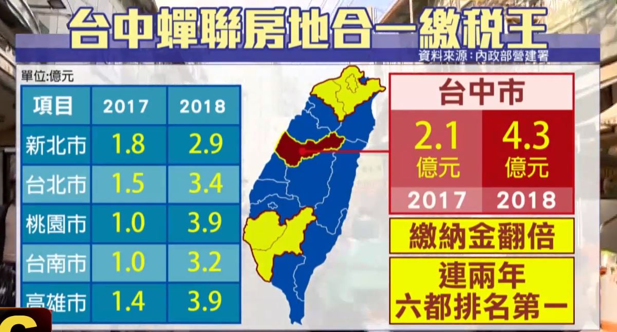不過買不起豪宅也可以投資房地產獲利,台中市房地合一稅收,2017年達到2.1億元,2018年則是4.3億元,連續兩年都在六都排名第一,成為六都繳稅王。