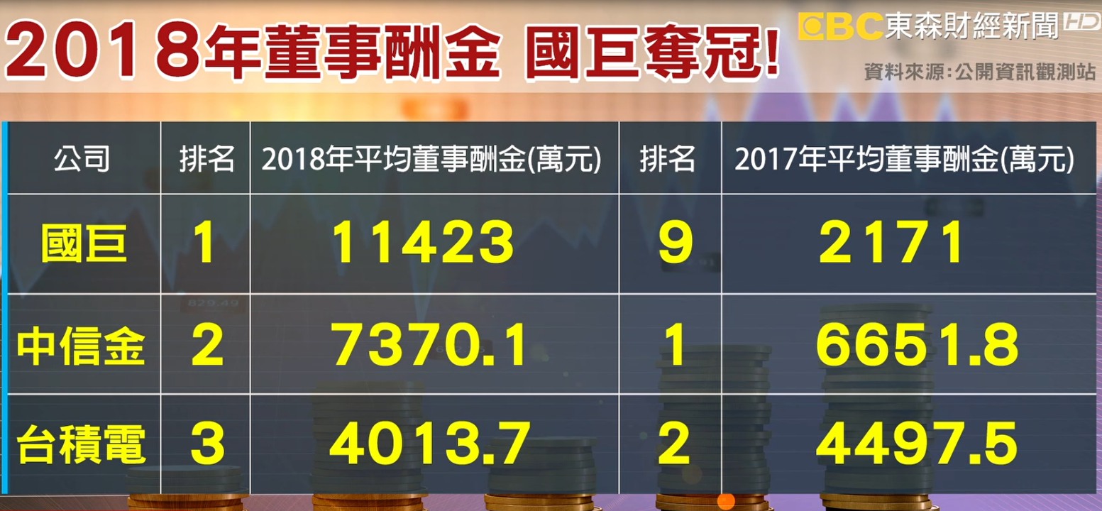 上市櫃公司董監事2018年酬金大揭露,被動元件大廠國巨以每股稅後盈餘80.3元創新高,董事平均酬金也衝上1.14億元摘下冠軍!另一方面,有7家上市櫃公司2018年虧損,但董事卻照領千萬薪水,讓民眾大呼實在是太不合理。