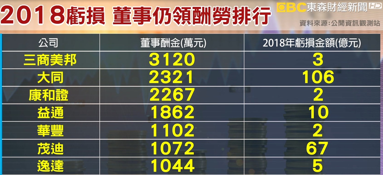 大同2018年受華映及綠能影響,虧損高達百億元,董事酬金仍然有約2321萬,高居第二名,旗下華映跟綠能雖然將要下市,酬金卻沒少,達295萬及440萬,但華映跟綠能說明,董事領的是車馬費,其實合理。