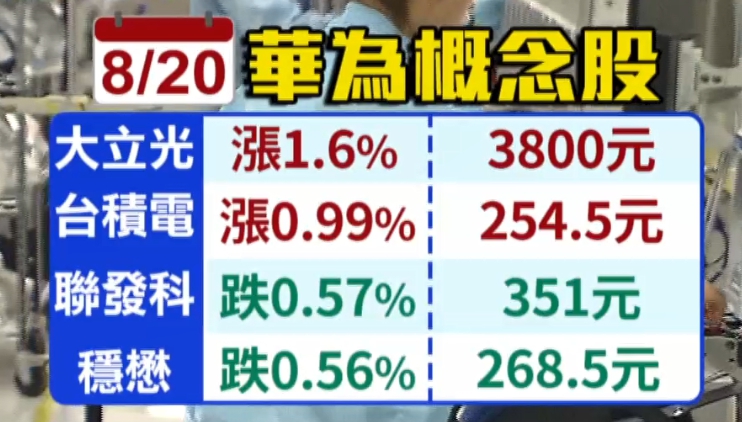 ▼20日的華為概念股沒什麼驚喜,漲跌互見,只有大立光漲60元攻上3800元,聯發科反而小跌0.57%收351元。(圖/東森新聞資料畫面)