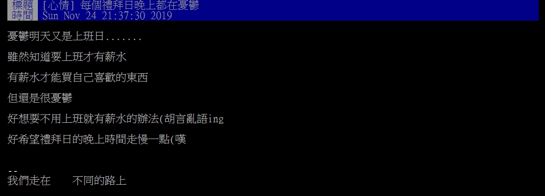 近日有網友於PTT上道出了自己憂鬱不已的心聲,並以「每個禮拜日晚上都在憂鬱」為題發文,原PO表示,「憂鬱明天又是上班日.....雖然知道要上班才有薪水,有薪水才能買自己喜歡的東西,但還是很憂鬱,好想要不用上班就有薪水的辦法,好希望禮拜日的晚上時間走慢一點。」。