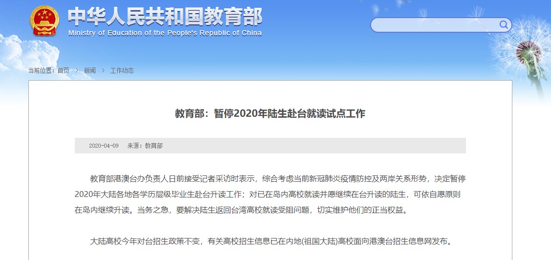 大陸教育部官網指出,陸教育部港澳台辦負責人表示,針對已經在台灣高校就讀並願繼續在台灣升讀的陸生,可以依照自願原則繼續升讀,當務之急,要解決陸生返回台灣高校就讀受阻問題,確實維護學生的正當權益。