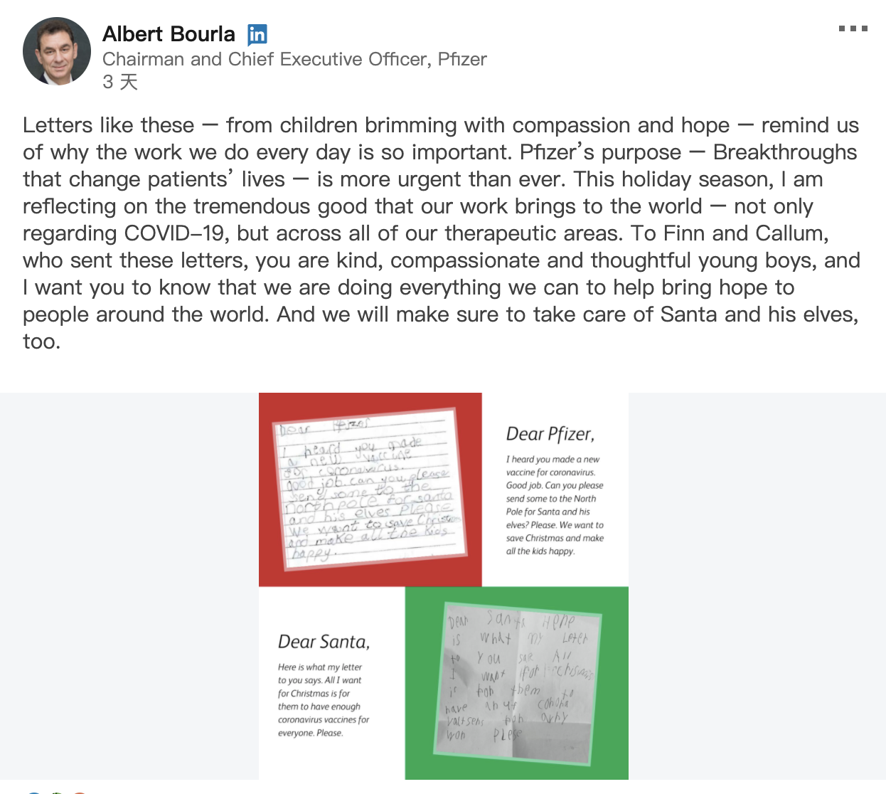輝瑞執行長布爾拉(Albert Bourla)在「Linkedin」上貼出小朋友寫給輝瑞的信,其中一封寫著「我聽說你們做出了新的疫苗,做得好!可以請你寄一些到北極給聖誕老公公和他的精靈們嗎?拜託你,我想要挽救聖誕節,讓所有的孩子們能感到快樂」。