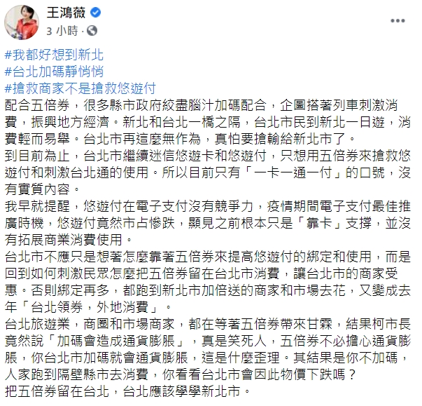 王鴻薇接著指出,台北市不應只是想著怎麼靠著五倍券來提高悠遊付的綁定和使用,而是回到如何刺激民眾怎麼把五倍券留在台北市消費,讓台北市的商家受惠。否則綁定再多,都跑到新北市加倍送的商家和市場去花,又變成去年「台北領券,外地消費」。