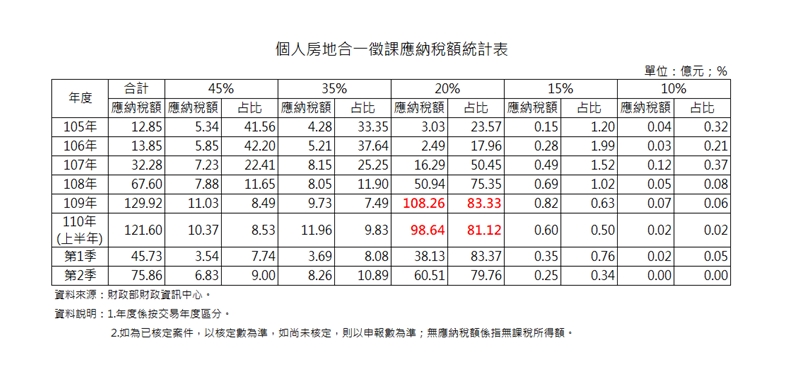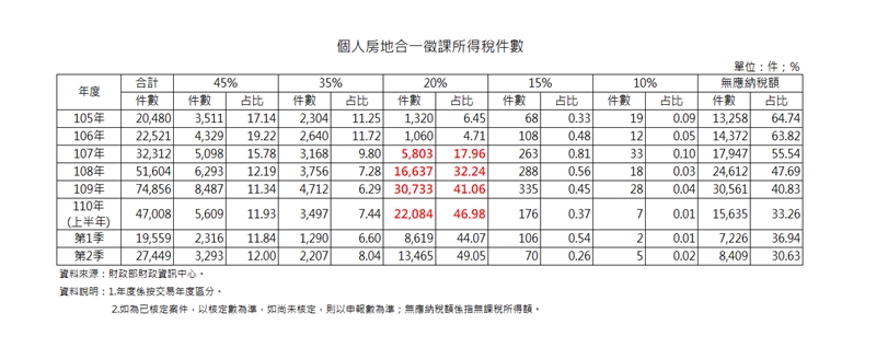 根據財政部財政資訊中心資料顯示,採計房地合一稅最多件數的20%稅率來看,去年(109年度)個人房地合一稅額中,佔比達83.33%,應納稅額更達108.26億元,件數共30733件;而今年(110年度)上半年的件數共22084件,稅額佔比已達81.12%,應納稅額也高達98.64億元!