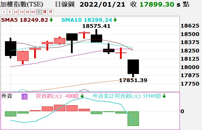 台股今(21)日跳空開低,資金大外逃情況下,電、金、傳皆疲弱,直接跌破萬八大關回測季線支撐,最終下跌318點,收在17899點,跌幅高達1.75%,成交量3041億元。