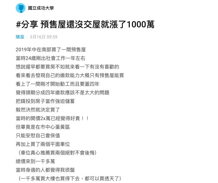 當時1坪開價20多萬元,但房子位於市中心,又有2個平面停車位,總價要1千萬元,雖然還是覺得有點負擔,但原PO仍毅然決然的買了。沒想到,這一買整個賺翻了!原PO笑說,當時身邊的人都覺得他很「盤」,因為一千多萬的價格都能買透天了,幸好他堅持買下,因為頭期款僅繳2年多,房價已從原本的1坪20多萬漲到1坪50萬,「房子還沒蓋好就已經快要翻倍了」,該房子總價多漲了1000萬。