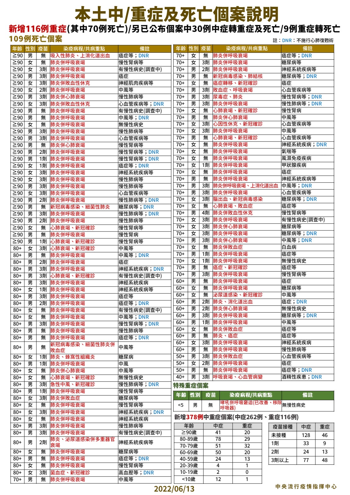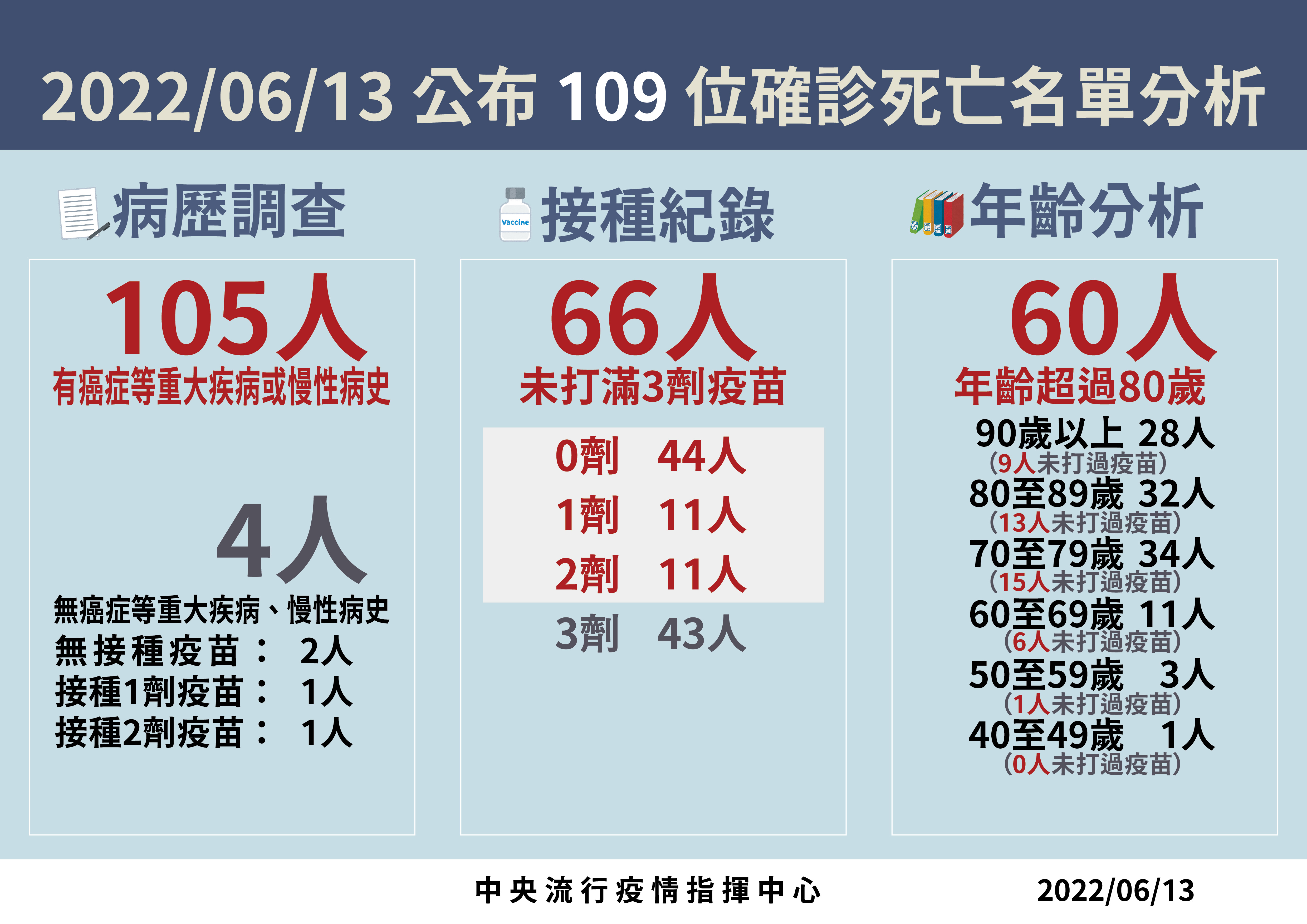 指揮中心指出,今日新增109例本土病例死亡個案,為61例男性、48例女性,年齡介於40多歲至90多歲以上,皆屬重度感染個案、105例具慢性病史、66例未接種3劑 COVID-19疫苗。確診日介於今(2022)年5月4日至6月9日,死亡日期介於5月19日至6月10日,詳如新聞稿附件。