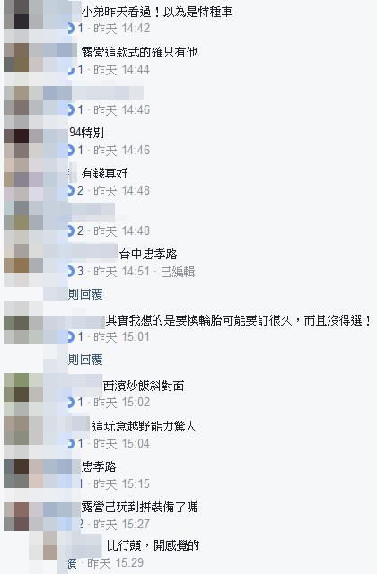新聞一出,許多網友看了羨慕說:「這個!根本像戰車!盾牌防彈」、「這台身價是千萬的」、「裡面有幾房幾廳幾衛浴?」、「買這台就有車有房了」、「有錢真好」、「露營這款式的確只有他」、「台中忠孝路⋯⋯」;也有網友驚訝說:「以為是特種車」、「露營已玩到拼裝備了嗎?」,另一網友則回應:「人家是比行頭,開感覺的!」;但也有網友質疑:「確定能上路嗎?」