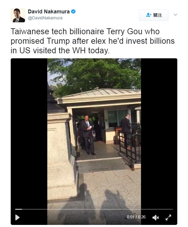 根據美國《華盛頓郵報》報導,郭台銘在美國當地時間27日下午低調造訪白宮,還在裡面停留了兩個多小時,結束之後郭台銘和幾位隨員要離開白宮,正好被報社記者捕捉到,不過當被詢問到是否有和川普會面時,郭台銘卻不願回應,和記者握手之後,還裝傻地說「我的記憶不太好,也許已經忘了」,既沒有證實也沒有否認。