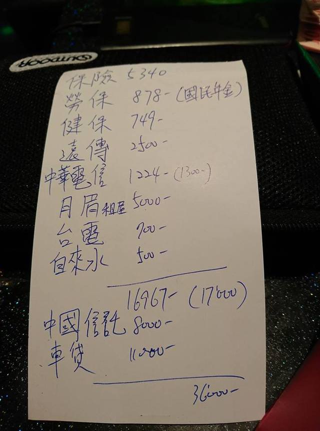 從原PO列出的支出明細可以看到,他每個月的保險5340元、勞保878元、健保749元、遠傳2500元、中華電信1224元、租屋5000元、台電700元、自來水500元、中國信託8000元、車貸11000元,全部加起來後,總計支出36000元。