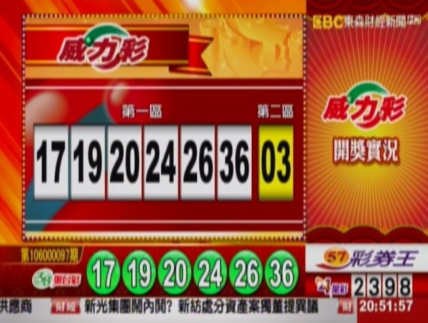 第106000097期威力彩:17、19、20、24、26、36,特別號為 03