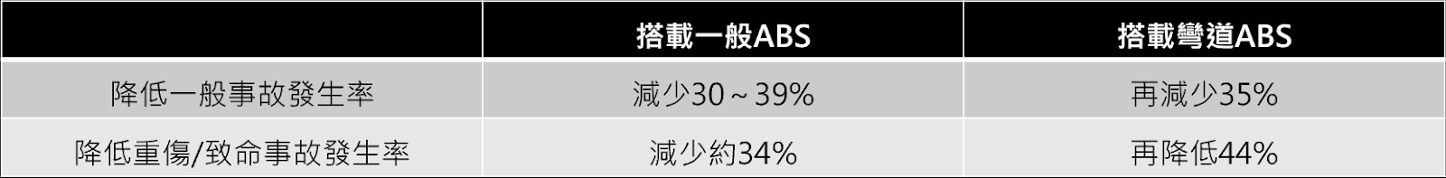 資料來源:Matteo Rizzi與 Jörgen Persson (2023) <The effectiveness of Cornering ABS on motorcycles in reducing real-life crashes, compared to regular ABS>