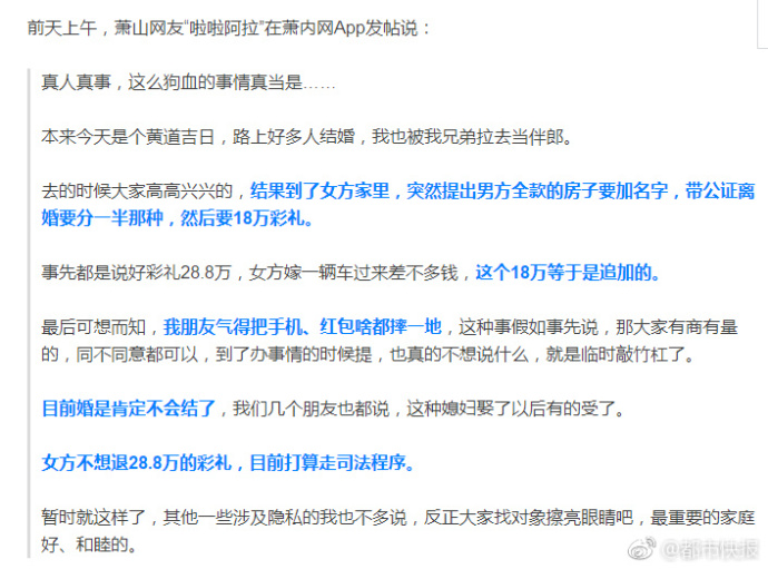 「這種事情如果先說,大家還有商量的餘地」,原PO替好友報不平,認為若先說明白的話,也不會落得當下如此尷尬的場面,女方一直到迎親時才提出要求,擺明了是臨時「敲竹槓」,讓他直呼「要是娶了這種媳婦以後有得受了」。據了解,這場婚禮最後無疾而終,但女方卻似乎沒有要退還28.8萬聘金的意思,雙方目前正尋求法律途徑解決。