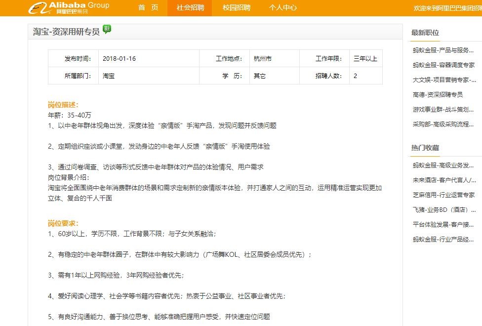 由於淘寶網欲開拓中老年消費群體,推出全新的「親情版本」,為了能更加精準且有效率的了解市場,阿里巴巴集團官網於16日,開出2個60歲以上「用研專員」職缺,並打算以人民幣35萬-40萬的高年薪(約台幣163萬-186萬元)聘僱。