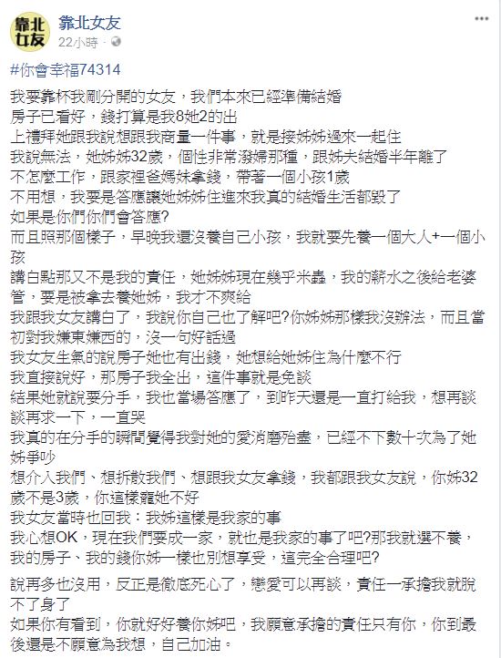 《靠北女友》抱怨,原本和女友已經準備結婚,而且房子都看好了,打算自己出80%,另外20%由女友付,沒想到女友上周突然找他商量,說之後希望能把姊姊接來新家一起住。