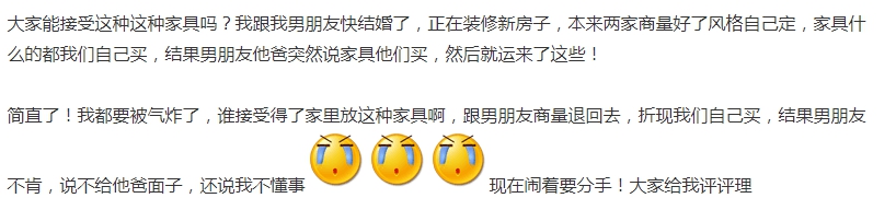 「誰接受得了家裡放這種家具啊」,不過這組家具和女網友理想中的風格實在落差極大,讓她忍不住哀嚎「我都要被氣炸了」,於是向男友抗議,強調自己實在無法接受,希望可以將家具退回去並折現,小倆口再另外買新的,不過男友非但不肯,還反過來指責她不懂事,不給男友爸爸面子,2人為此事吵得不可開交,男友甚至直嗆乾脆分手、退婚,讓女網友心急又慌張,無助之餘只能求救網友「大家給我評評理」!
