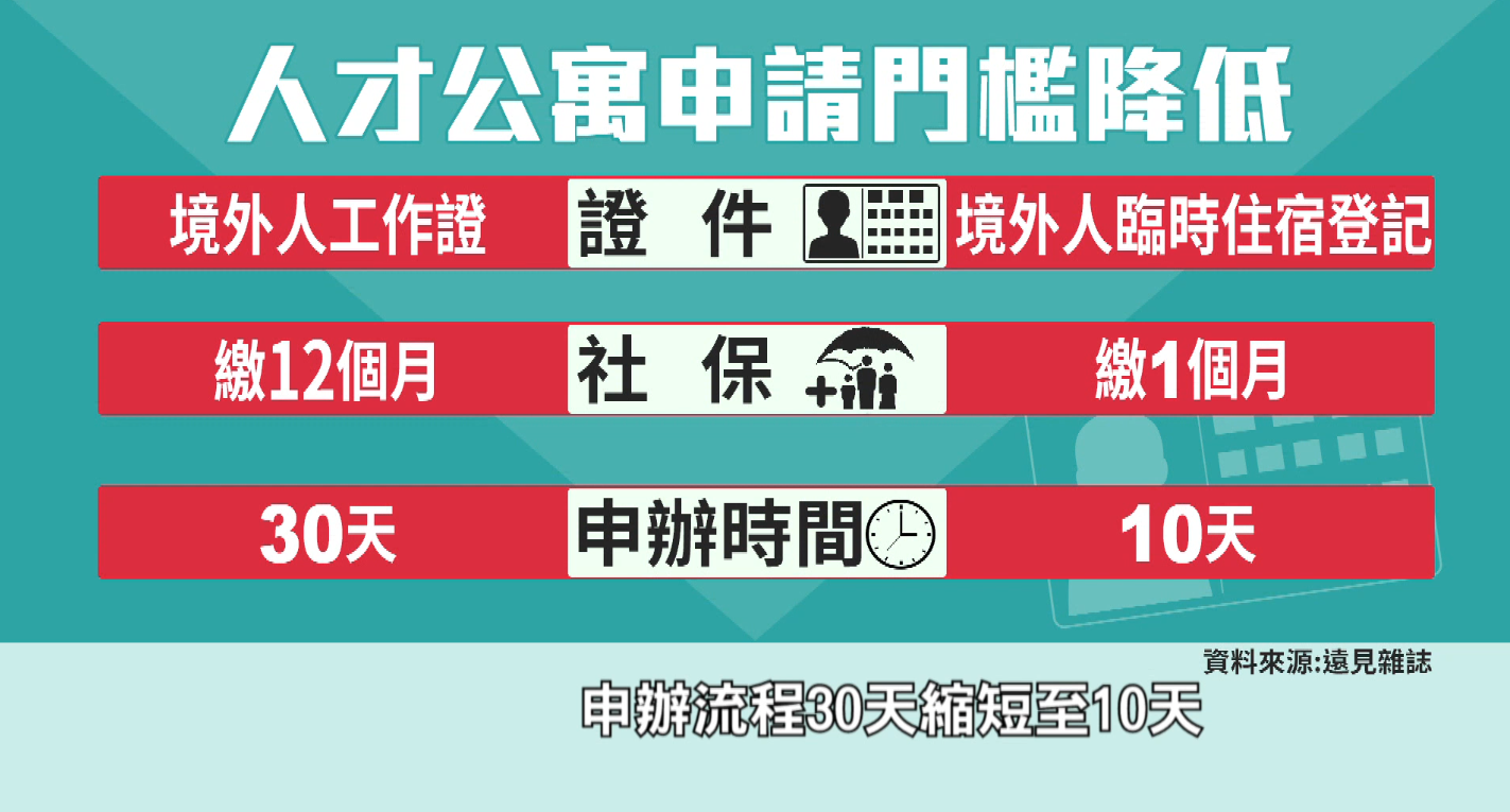 優惠政策,讓在大陸就業的台灣人,可以承租白領公寓。高端人才,也有買房、住房補貼;等於和大陸民眾 站在同一起跑線。長久下來,產生磁吸效應,讓台灣面臨 人才流失的可能性。