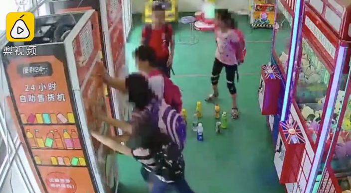 綜合陸媒報導,這起事件發生在上個(5)月22日,從監視器畫面中可見,5位揹著書包的學童走進店內後,不是要投錢買飲料,反而是鎖定自動販賣機,只見有人徒手撬開機身,有人則是大力搖晃機身讓飲料一瓶接著一瓶從縫隙中掉落,還有人來回跑到機台後方觀察狀況,可見動作熟練、分工細膩。