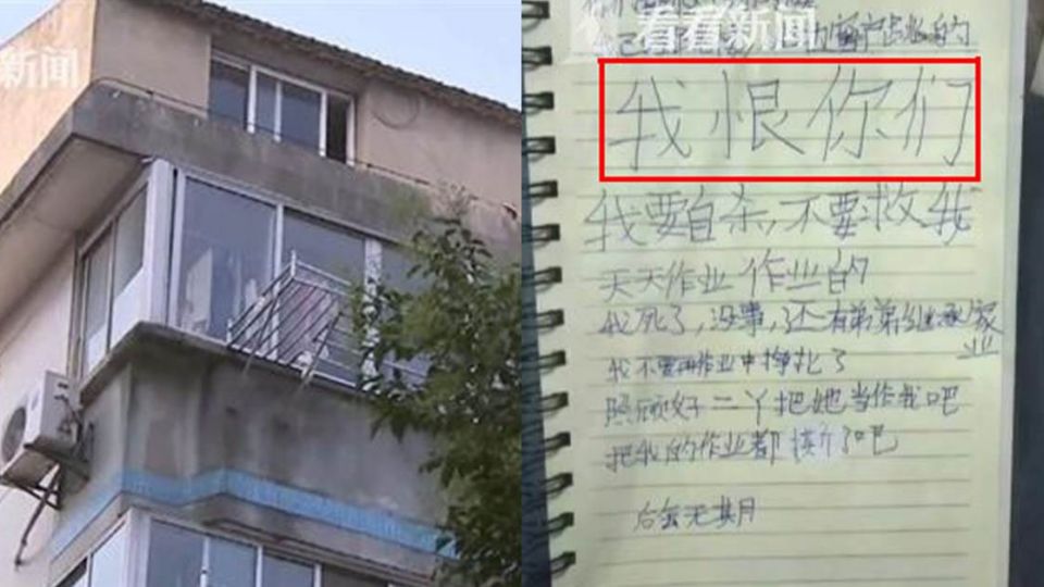 女童在家中留下一封遺書,文中寫著自己因為課業壓力被壓的喘不過氣。女童在筆記本上寫著「你們看到這個的時候,我已經跳樓」還用大大四個字寫著「我恨你們」,還要父母不要救她。文中提到「天天作業、作業的,我死了,沒事,還有弟弟繼承家業,我不要在做作業中掙扎了,把他(弟弟)當作我吧,把我的作業都撕了吧。」女童負面情緒已達臨界點,才會作出最傻的決定。還在最後寫著「後會無期」,看得出來女童對於人生的絕望,令人感到不勝唏噓。父母管教孩子時,多留意孩子情緒,避免發生憾事。