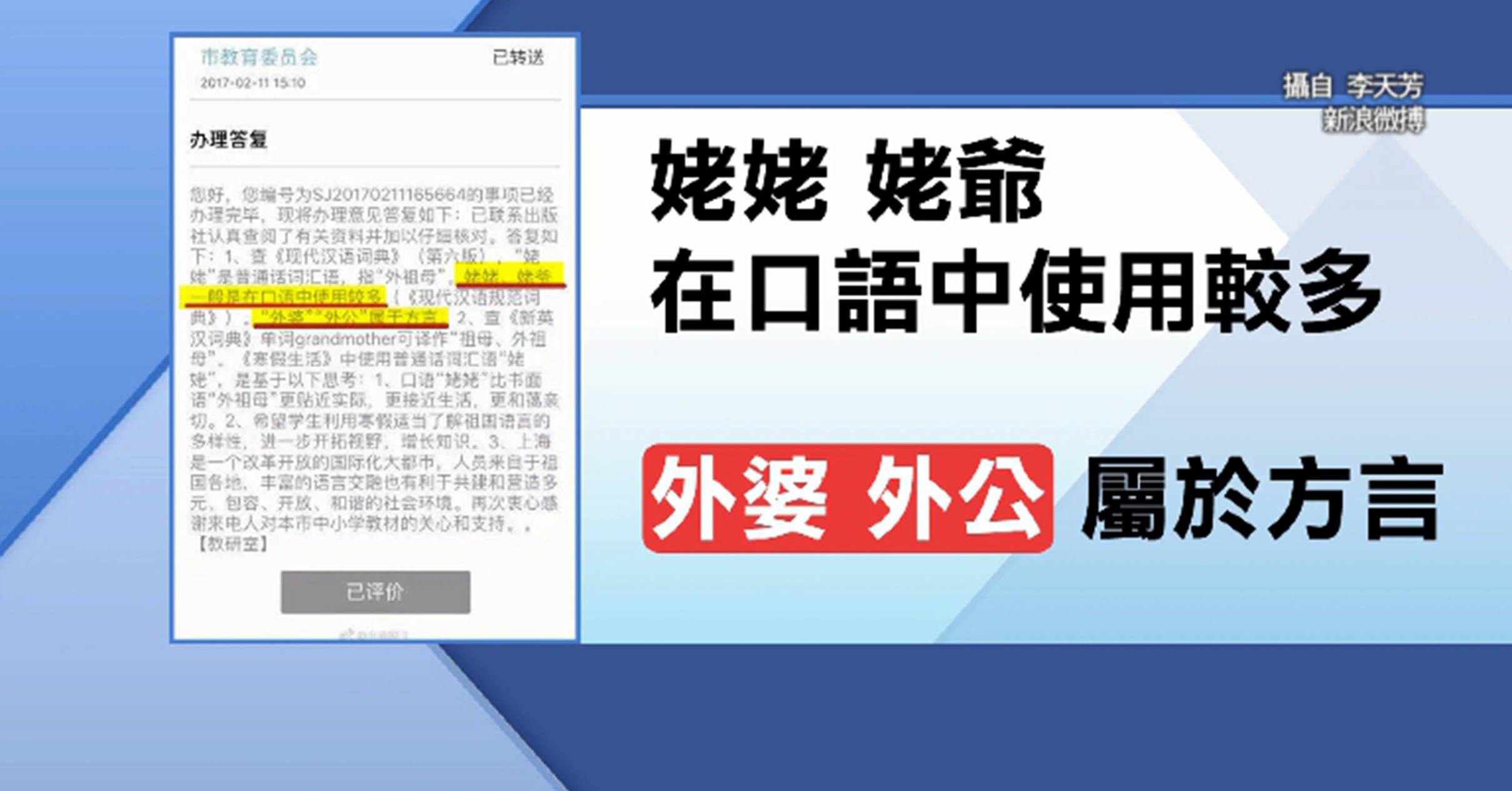 作者李天芳:「沒有人規定那是南方的,我們北方也有這樣的稱呼,因為有些叫外婆,有些人家也叫姥爺、姥姥。」作者李天芳出身陝西也算北方,文章以她親身經歷寫成,她強調,叫外婆、姥姥,是看個人習慣 ,問題不在於方言或口語,而是基本對作者的尊重,現在上海市教育委員會出面滅火,外婆與姥姥保衛戰才平息。
