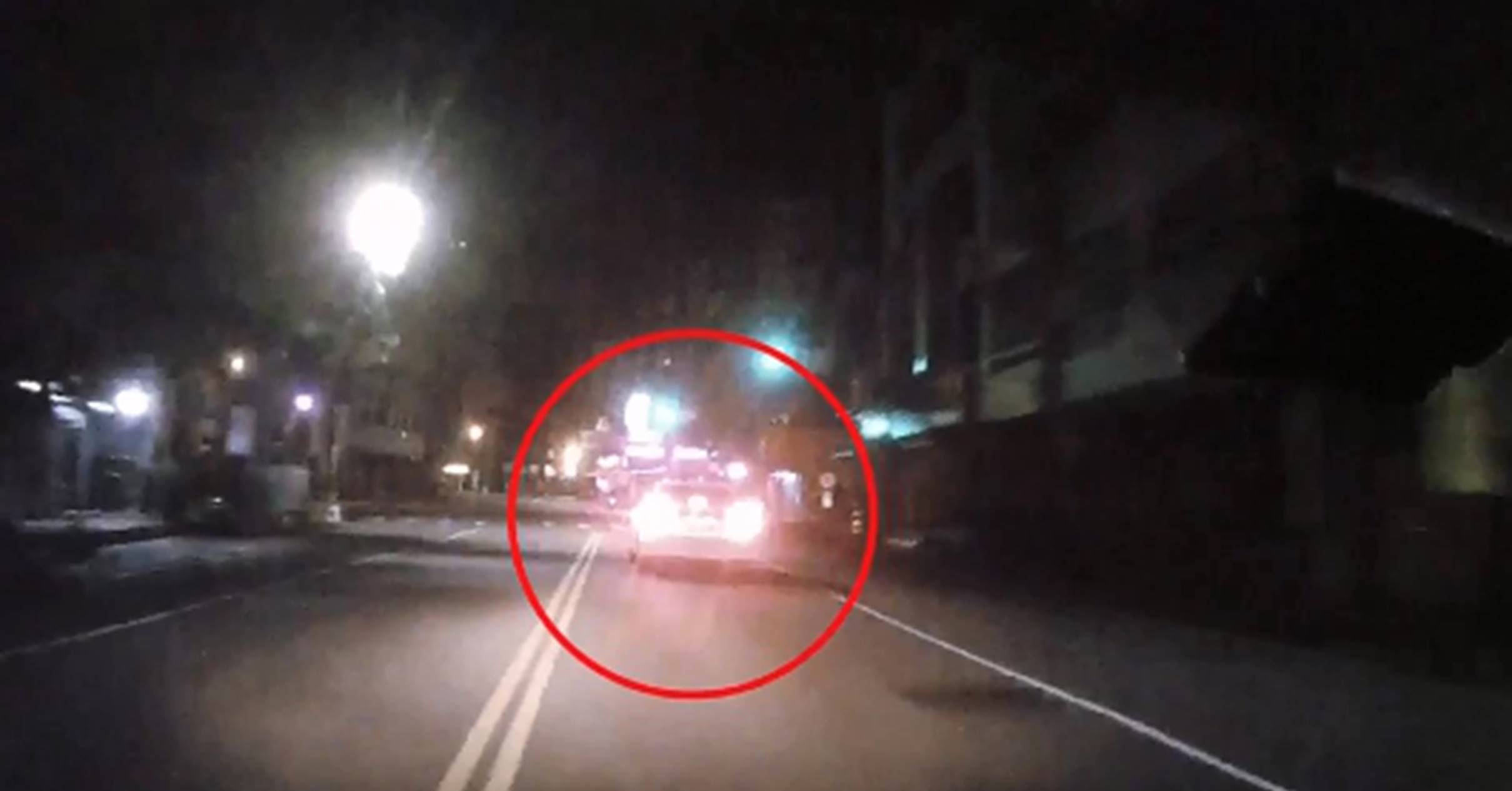 警方準備攔查的白色轎車,一見到警方立刻迴轉,開始加速跑給警察追,只是沿路都是紅燈,白色轎車見到紅燈全部闖過去,一連闖了9個紅燈,開到巷子裡又突然乖乖停下來。