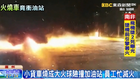 加油站,加油站員工看到小貨車像一團大火球高速行駛過來,全都嚇壞了,就怕撞上發生大