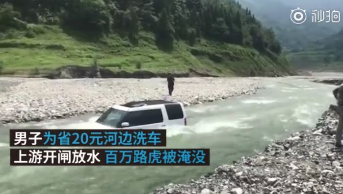 根據《澎湃新聞》報導,四川成都一名男子為了省20元人民幣的洗車費,25日將價值百萬的Land Rover越野車開到河邊,打算自行洗車,沒想到上游剛好進行開閘洩洪,導致河水水位猛烈上升,男子發現時已無法將車開離河道,最後只好棄車逃命,在河中央的石頭上看著愛車被水淹沒,並趕緊打電話報警求助,救難人員到場後,花了約10分鐘才將男子救起,消防人員隨後也出動堆高機,將車子從河中拖上岸。