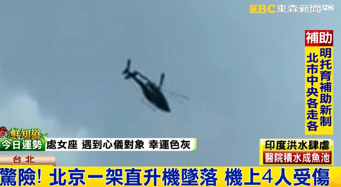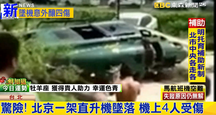 這起直升機墜落意外,發生在大陸北京30日上午11點左右出現失控情況,所幸墜落時沒有發生爆炸或是起火才讓機上4人得救,不過到底是甚麼原因導致直升機失控,目前大陸當局還在調查當中。