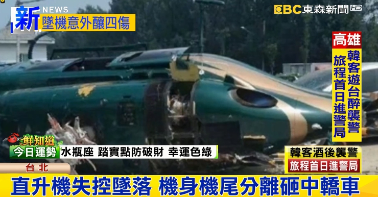 根據現場影片來看,這架直升機墜落時機身和機尾已經分離,現場民眾趕緊上前查看,而機上四人最後緊急送醫,幸好只有受傷沒有生命危險。