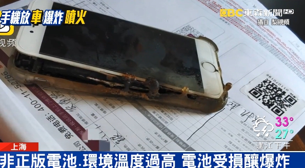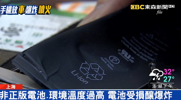 3C達人Tim:「他用的不是官方正版電池,在車內儀表板上面,是非常過熱的狀態下,手機電池的話可能在充電過程,或是環境溫度(高)下導致手機會出現燃燒情形。」