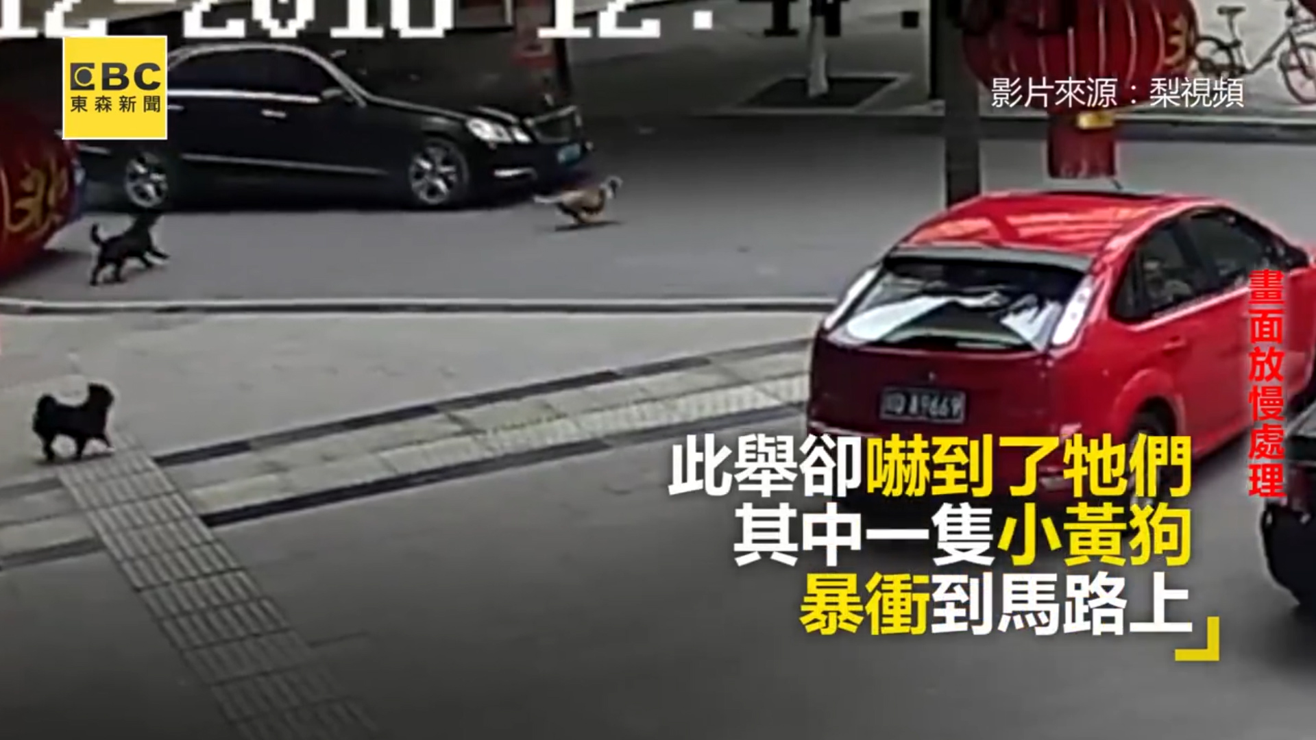 從監視器畫面看,某家飯店門口聚集了一群狗,員工怕影響其他客人,拍拍手想將牠們趕離門口,這個舉動雖然管用,卻將其中一隻小黃狗嚇得暴衝到馬路上,一部轎車閃避不及,當場撞上小黃狗不幸將牠輾斃。