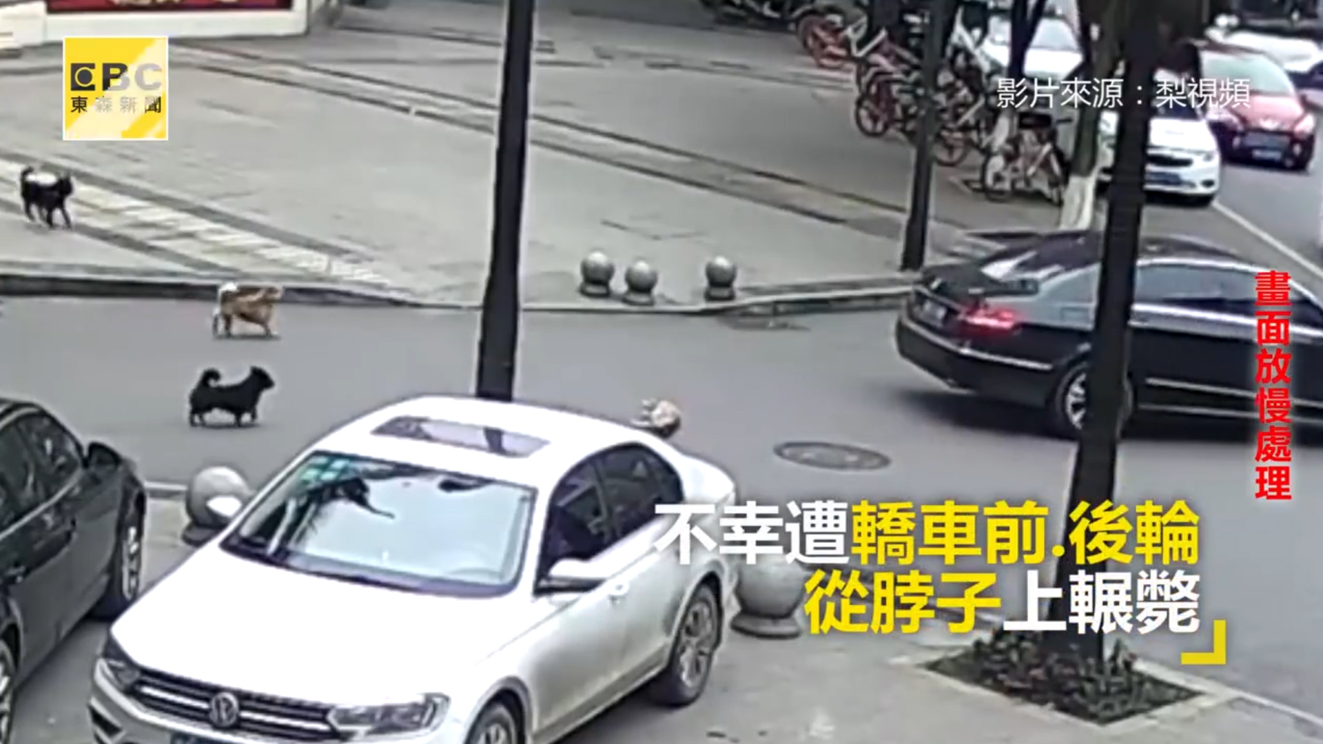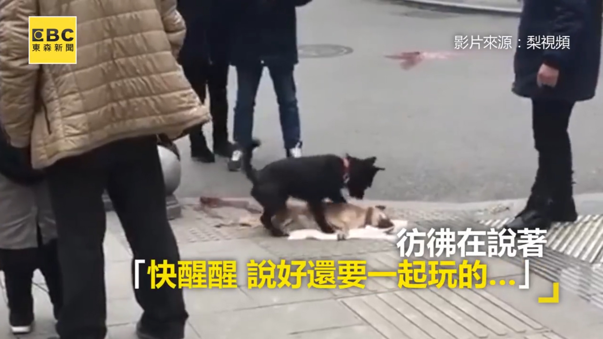 狗不幸遭轎車撞上,倒在馬路上動彈不得,顯然已經往生,身旁一隻小黑狗卻不死心,不停地用雙腳拍打