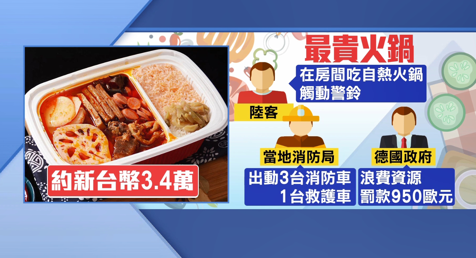 懶人火鍋」稱號的自熱火鍋,想不到卻意外觸動警鈴,造成當地消防隊,出動3台消防車和1台救護車到場,事後德國政府對這名遊客開罰950歐元,相當於3.4萬新台幣,消息一出引發討論。