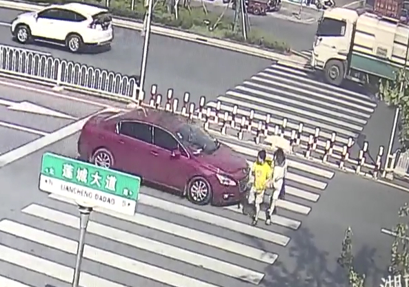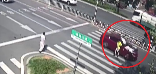 從曝光的監視錄影畫面可見,一輛紅色轎車的車速相當快,在通過斑馬線時並未減速,撞到撐著陽傘的白衣女子後,還往前開行了幾米遠後,才緩慢停下。 據《