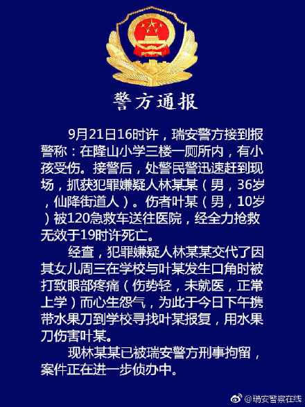 根據大陸媒體報導,大陸浙江省溫州瑞安市警方於21日16時許接獲通報表示,在隆山小學三樓的廁所內,有小孩受傷,於是馬上派員警和急救人員到案發現場,不幸的是,遭砍的男童經急救後已於19點多傷重不治,目前林姓男子已被警方逮捕,而警方將進一步繼續偵辦。