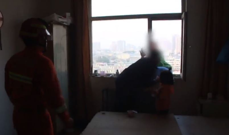 影片中能看到,一名婦人坐在14樓的窗台邊,隨時準備一躍而下,而她的小女兒則在一旁害怕地嚎啕大哭,員警們都不敢懈怠,小心翼翼地勸說婦人 :「孩子哭,你不心疼?」婦人則情緒失控地哭喊,要不是因為孩子,她早就跳下去了,「我從這裡跳下去後,一切都結束了!」