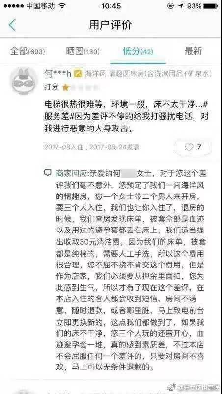 竟惡人先告狀!中國大陸一名女子,去(2017)年在一間飯店訂了雙人房,入住退房後她在網路上留下1星評價,還怒批飯店的環境一般、床不乾淨,大批網友跟風怒罵飯店,讓飯店方實在不堪其擾,只好跳出來打臉,女子當天不但帶2男入住,還在床上留下一堆血跡及沾血保險套,才終於讓真相大白。