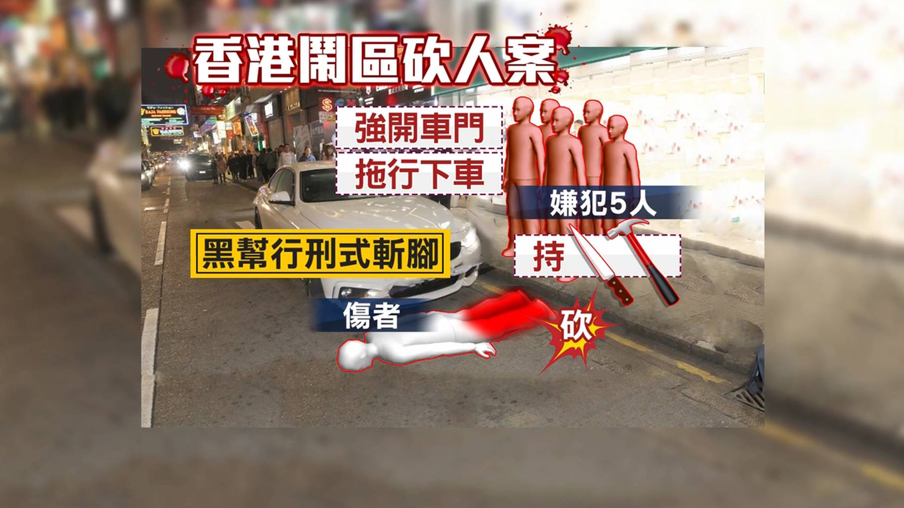 週五晚間九點多一名男子血濺香港鬧區尖沙嘴,雙腳被砍成重傷倒臥在店家門口 求救相當嚇人。香港媒體:「將轎車停在尖沙咀街道,期間多個男子拉開車門將他拖出車外,用刀砍他。」