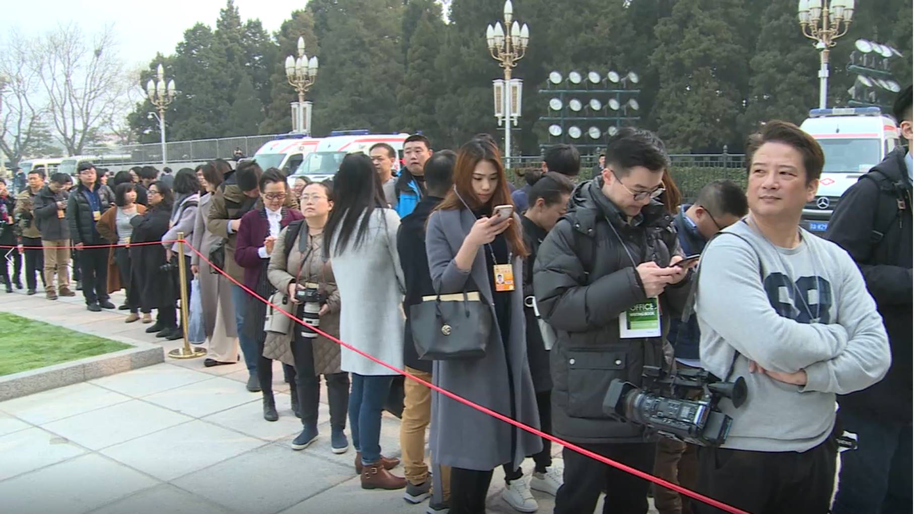 大陸兩會正式召開,大批媒體提早進場,還得一一檢查證件。東森新聞記者劉依晴:「大陸兩會政協今天正式召開,可以看到很多記者大排長龍準備進到會場,政協主席汪洋的工作報告當中,台灣的問題則是放在2019年的主要任務。」