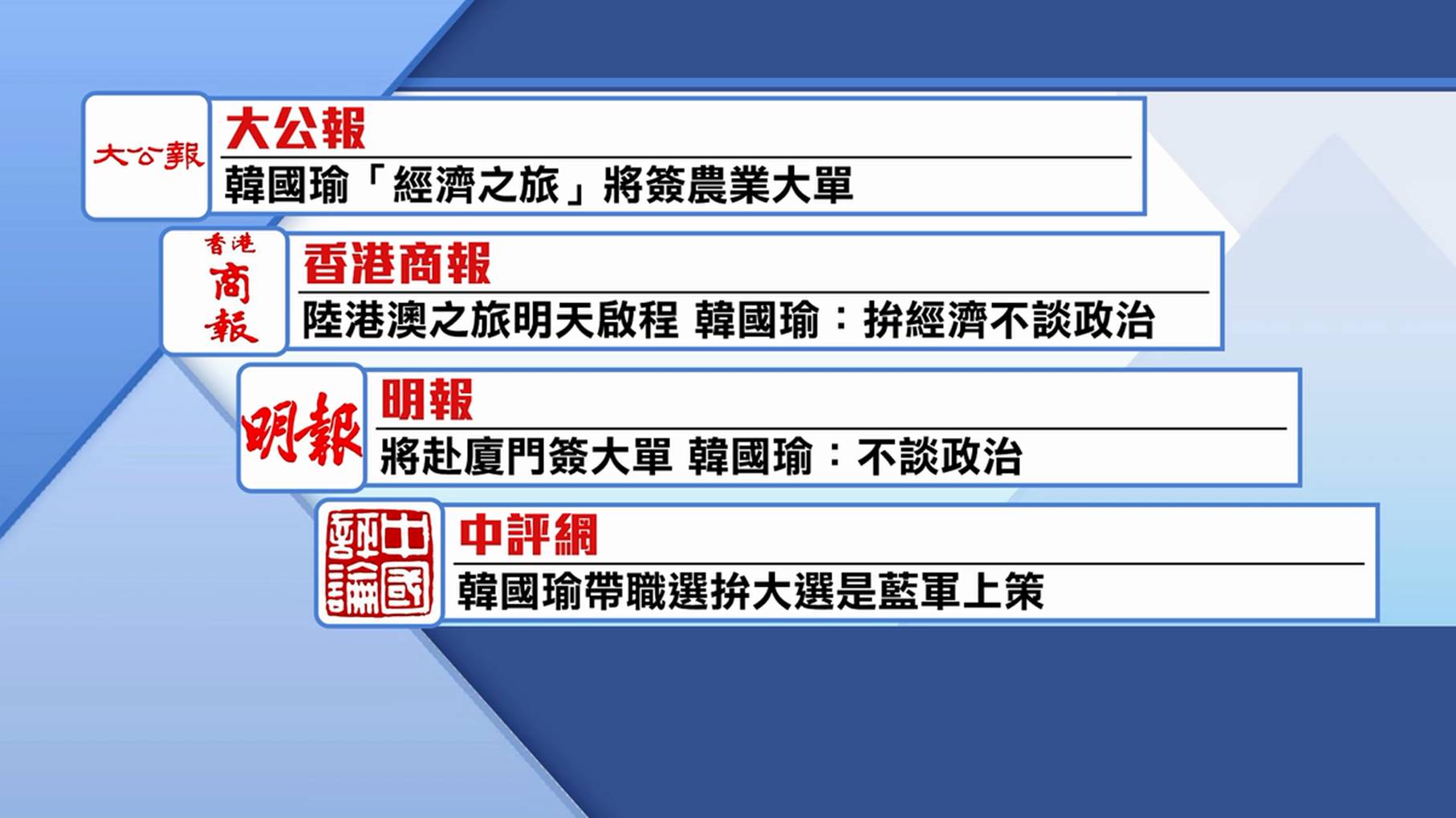 到底選不選總統成為話題,韓國瑜出訪前一天,香港當地就有不少媒體刊登相關報導,大公報稱這趟是「經濟之旅」將簽農業大單,香港商報預告他將啟程,但「拚經濟不談政治」, 明報也將重點擺在簽大單不談政治,中評網也曾報導,韓國瑜帶職選拚大選是藍軍上策。